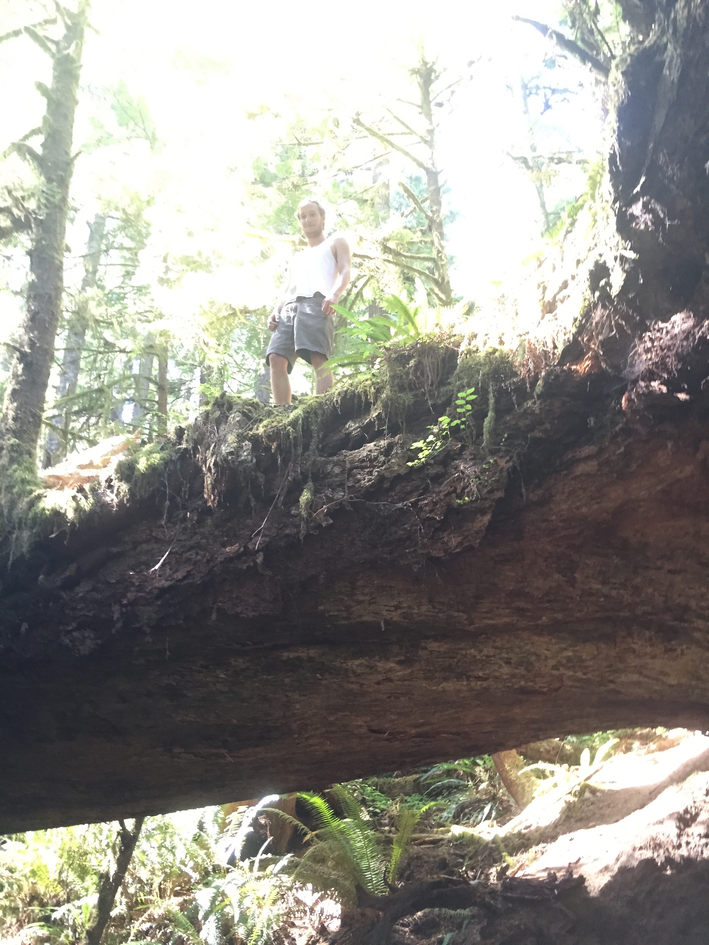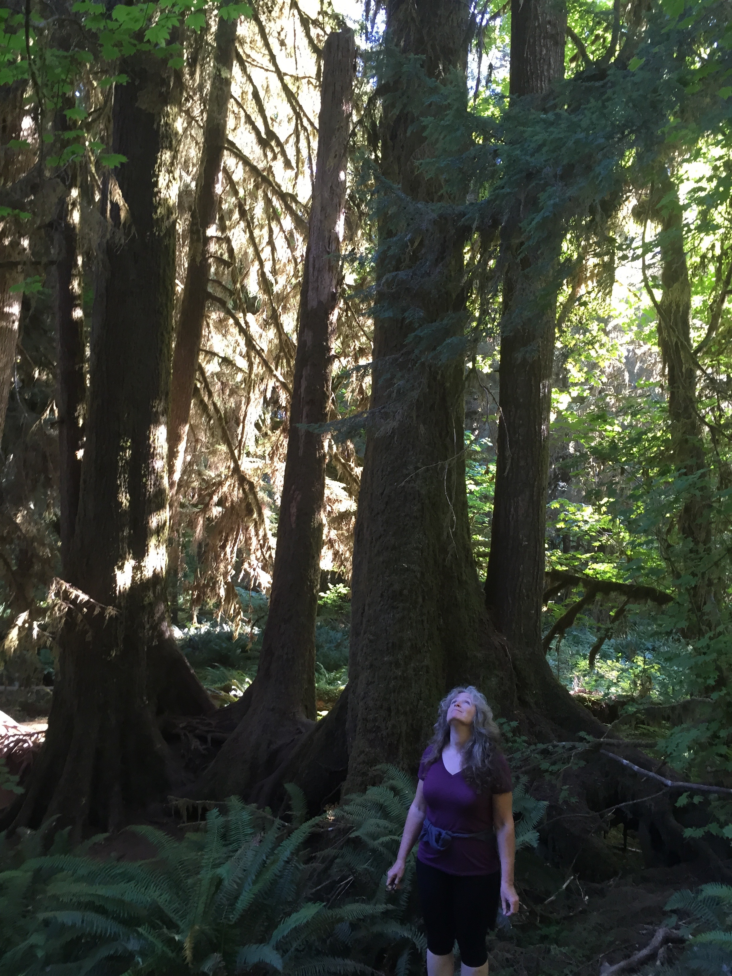 This day started like any other. A night or two at a campground followed by the next day’s drive. This day, though, contained a little more action than I typically like, during the daily drive. We were looking for the road to the Quinalt Rain Forest, in the southwestern corner of Olympic National Park. I was leading the way with the rig and took what turned out to be a wrong turn. We passed through a quaint village and some homes deep in the forest, but the road soon narrowed into a single track. Not exactly the place you want to be towing a 27 foot trailer! I kept driving, hoping for some kind of turnaround, but the road only got narrower and narrower. Eventually I saw a sign for “School Bus Turnaround” but it turned out to be not large enough for me to turn around in. To use it, I would have had to perform a three-point turn. But, and I’ll make a confession here and now: I DON’T KNOW HOW TO BACK UP! So far we’ve been lucky with pull-through campsites and mostly ample gas stations, but there had to come a point where I would be confronted by my ignorance. i made a couple attempts at the three-pointer, but the trailer always seemed to go opposite of how I wanted. And Sofie, my riding companion, was getting pretty anxious! MISSION ABORT! Luckily some nice locals came by and offered to lead the way out, to a bridge up the way connecting our road with a road out. The road soon turned to gravel and we were consumed by a cloud of dust. The road over the bridge leading back to the main highway had a big sign recommending against RV’s due to narrowness and terrain, but at this point I was committed. The cloud of dust grew denser and the rig was rockin’ and rollin.’ Soon pavement was under the tires again and we stopped to meet our saviors and all had a good laugh. “I hope you don’t hate me for that,” said the leader. “I hope you don’t hate me for taking you an hour out of your way!” I replied.