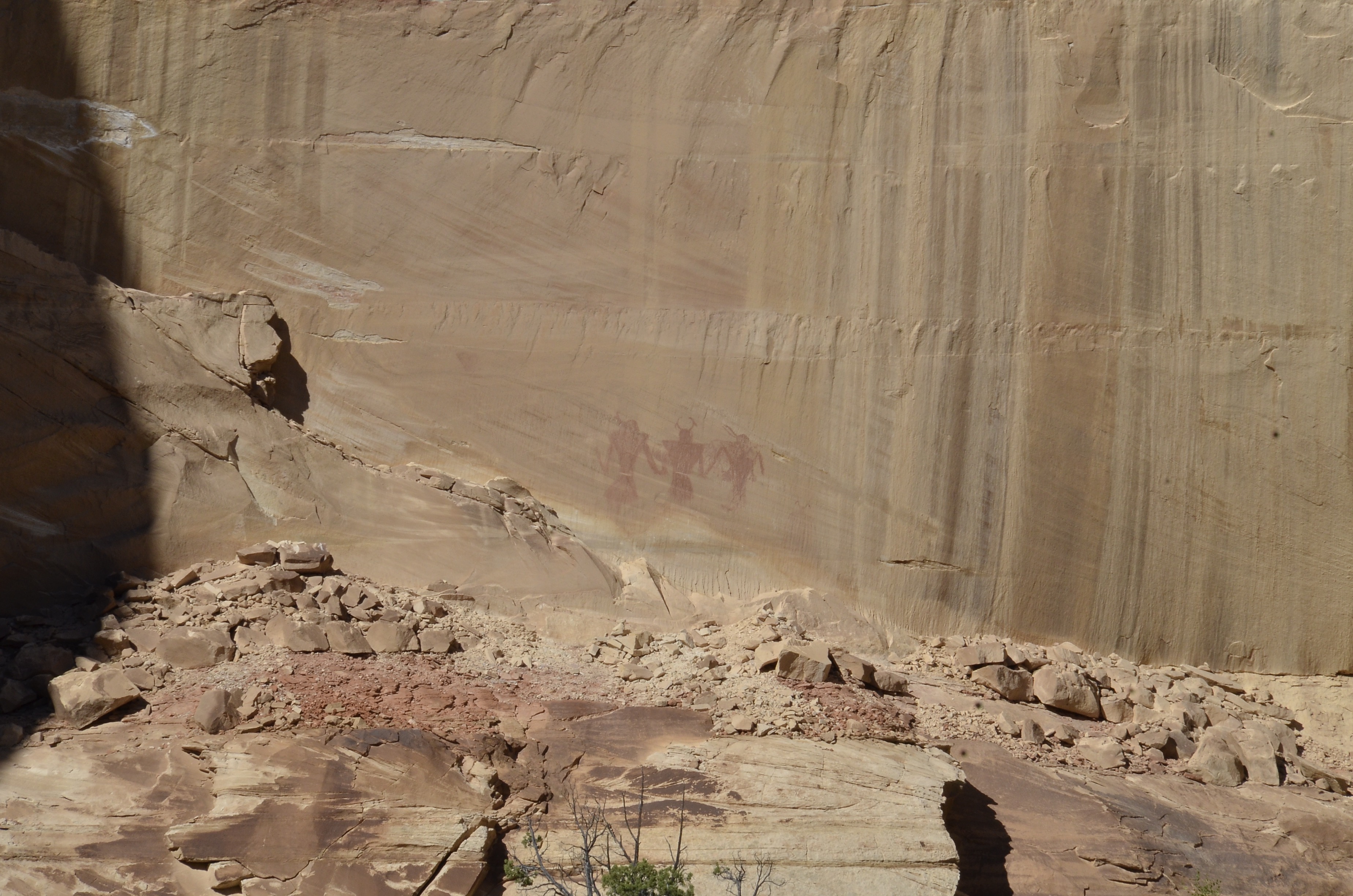 Yesterday, since it was a Monday following a very busy weekend, we decided to strike out and see Lower Calf Creek Falls. This is the main attraction at this Recreation Area, and most people that visit hike the 3-4 hour, 6 mile roundtrip trail. The trail is mostly flat and sandy, carrying one up the canyon past stunning rock formations and some other surprises. We knew what to expect, but were still amazed once we reached the Pictograph viewpoint. Across the canyon, are three large figures painted with red pigment. With their trapezoidal shape, depiction of arms and legs, and elaborate head dresses, these images are typical of the culture known as the Fremont. Archeologists speculate that it may represent significant events, religious ceremonies, deities, lineages, maps or even warnings.
