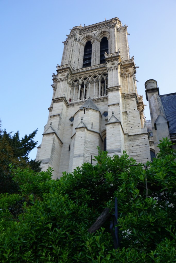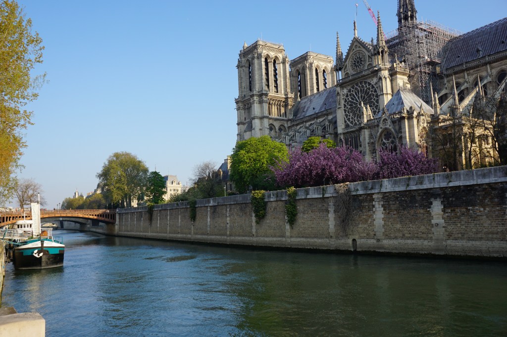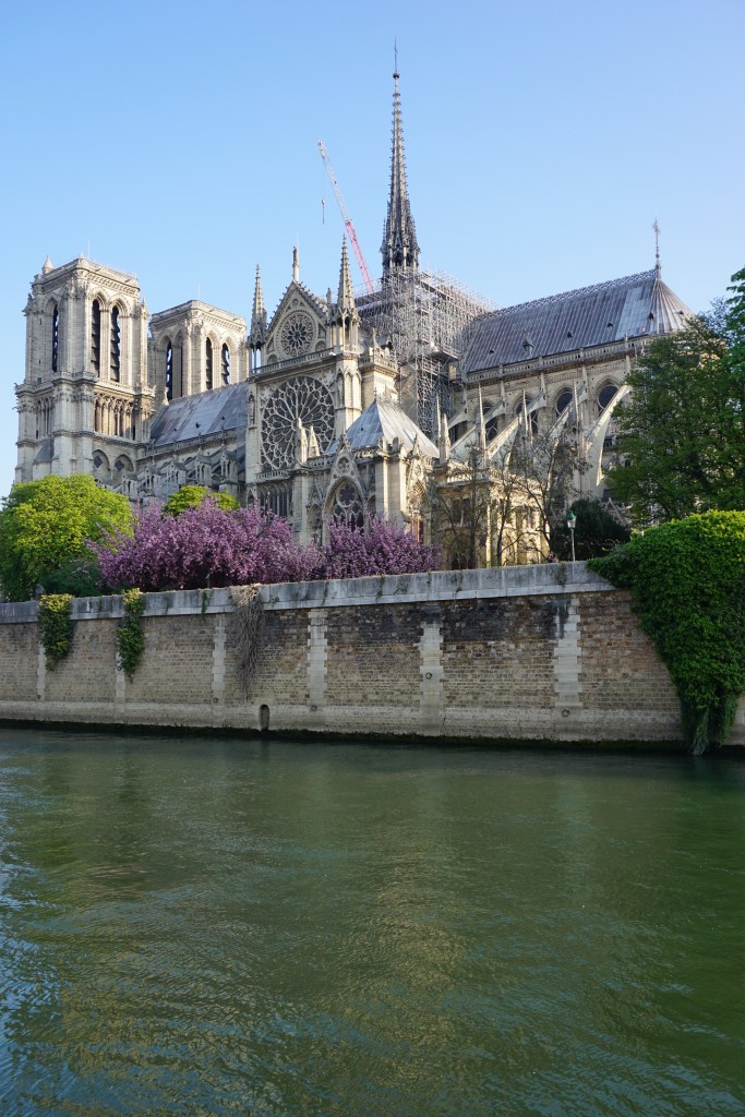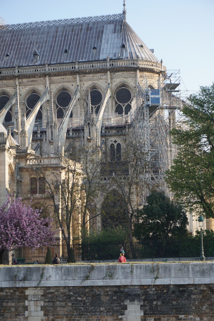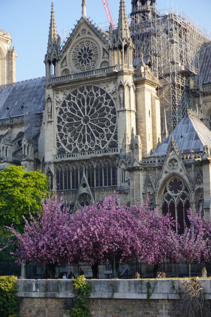 When we left our little hotel, Hotel Rue St. André des-Arts, in this morning, we immediately headed for I’lle de Cité and the fabulous Notre-Dame-de-Paris to catch it in the early morning light of a brilliant spring day! We were anticipating brilliance and we weren’t disappointed. One of the best things about the island and its cathedral was that the Japanese Cherry trees were in full bloom, on the glorious, early spring morning – “The most beautiful time to visit this area is in the early spring when all the flowering trees by the cathedral are in full bloom and you realize why everybody keeps telling you are lucky to be in Paris. The city reveals itself to you in certain moments, in certain angles of light. The aesthetic realization cannot be forced. It may only last a moment, and you may long for more primitive landscapes, but the flash of joy is recorded.” (source: aparisguide.com)