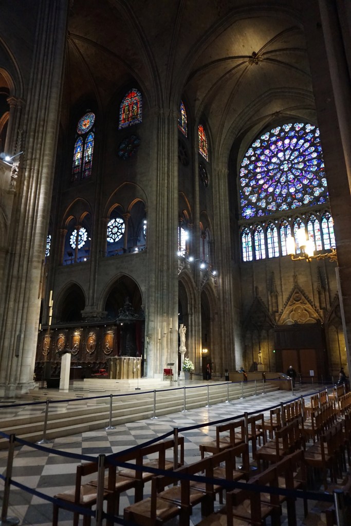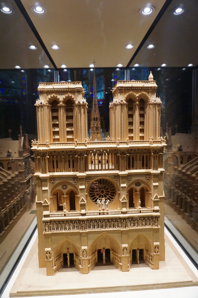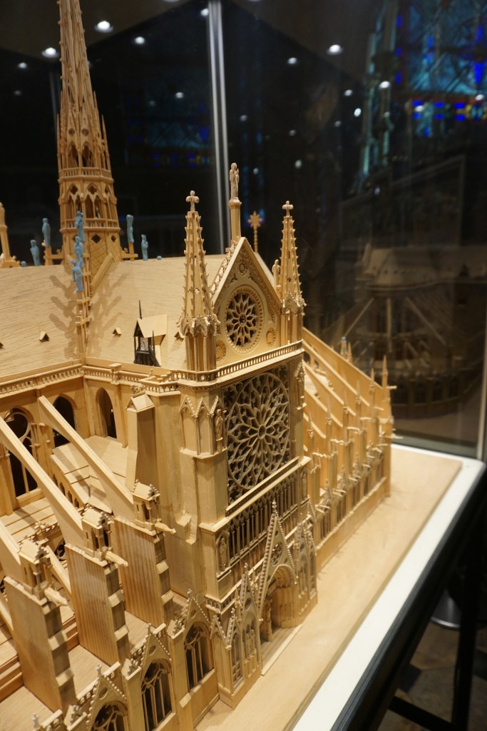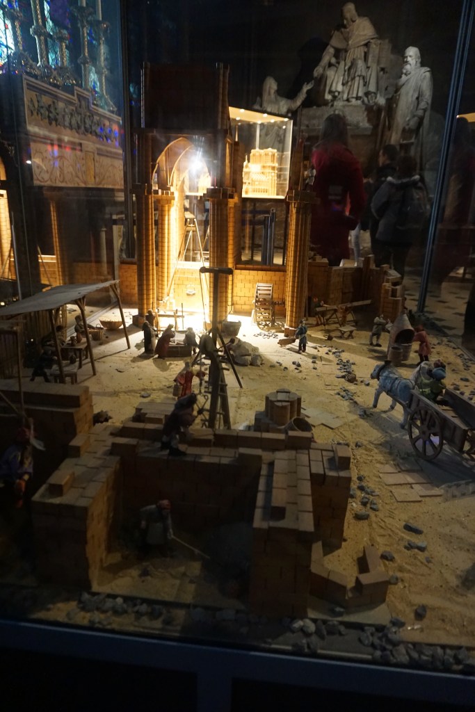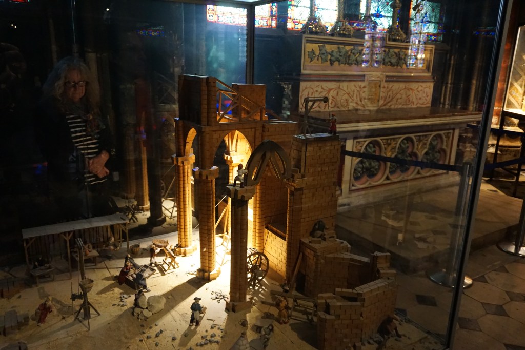 From the beautiful stained glass – especially the three giant rose windows, to the stone groin vaults of the ceiling with its delicate ribs, the ornament; all together so impressive! Behind the choir in the apse there were two wooden scale models of Notre-Dame-de-Paris. One was of the exterior of the cathedral and the other was extremely interesting: a model of the construction of the cathedral (which spanned over 180 years!), with craftspeople and laborers employing all the ingenious machinery constructed to get the job done. Mandy, an architect by training and an architectural model builder by profession was blown away: