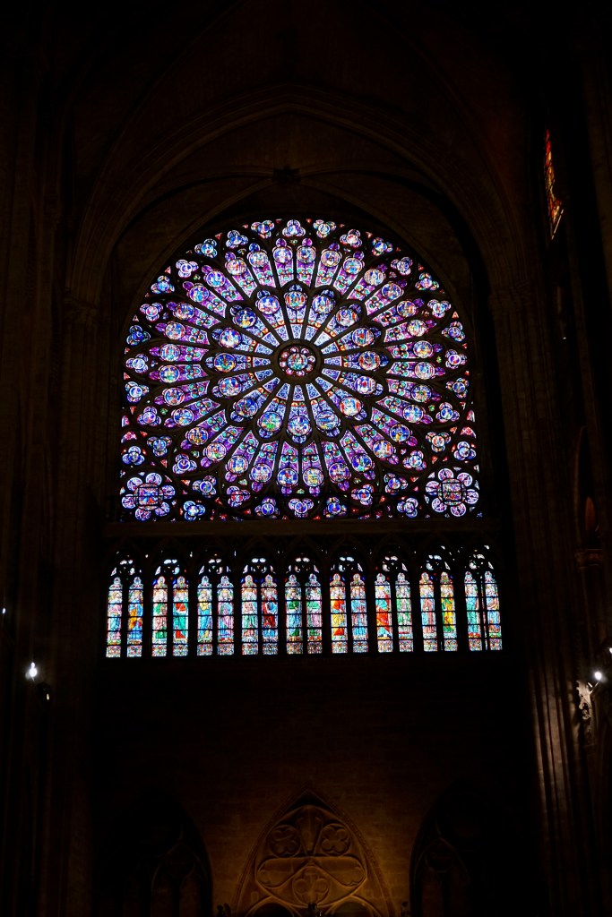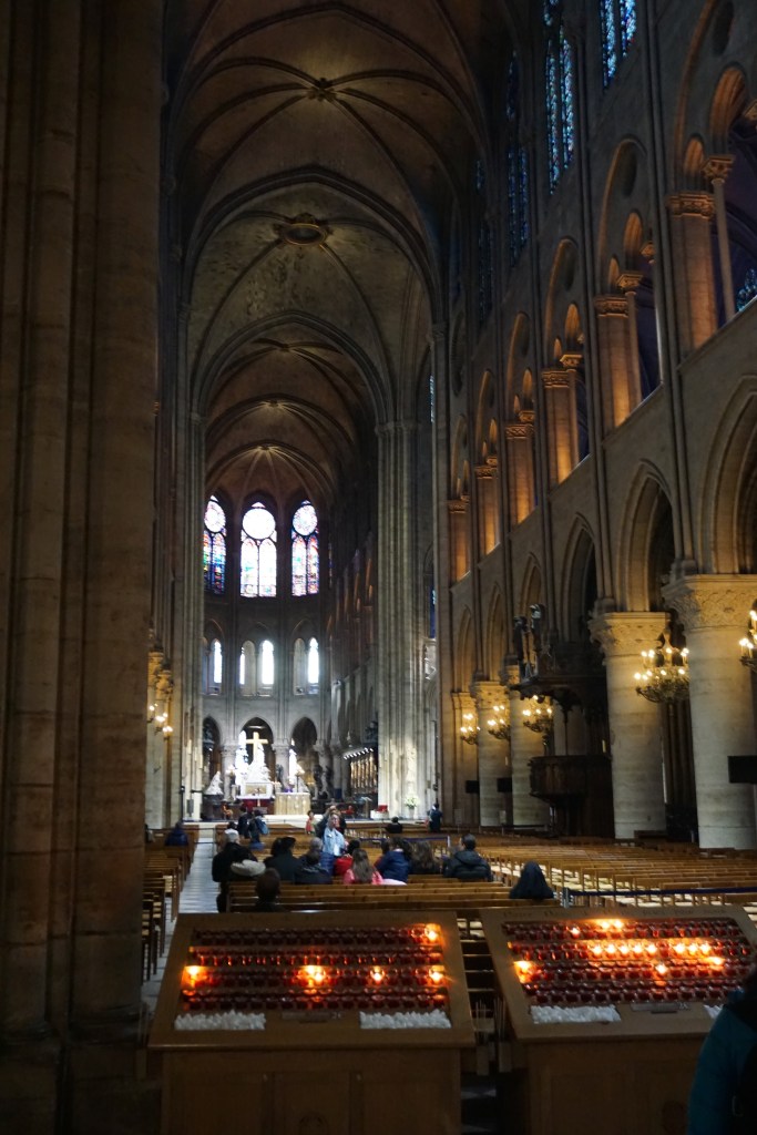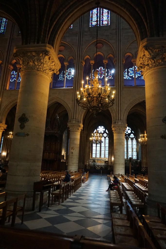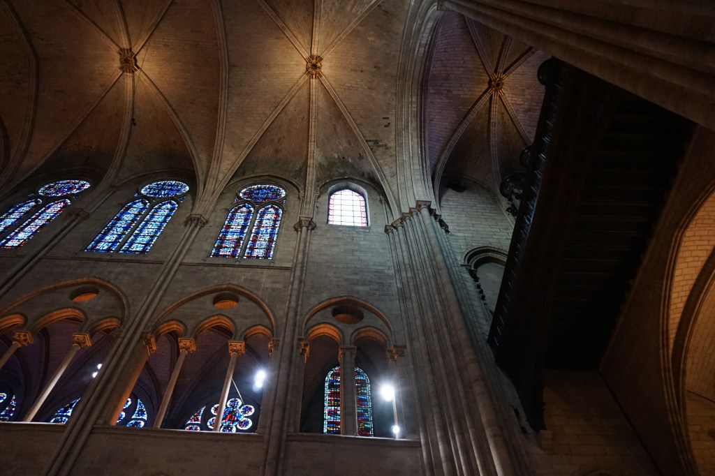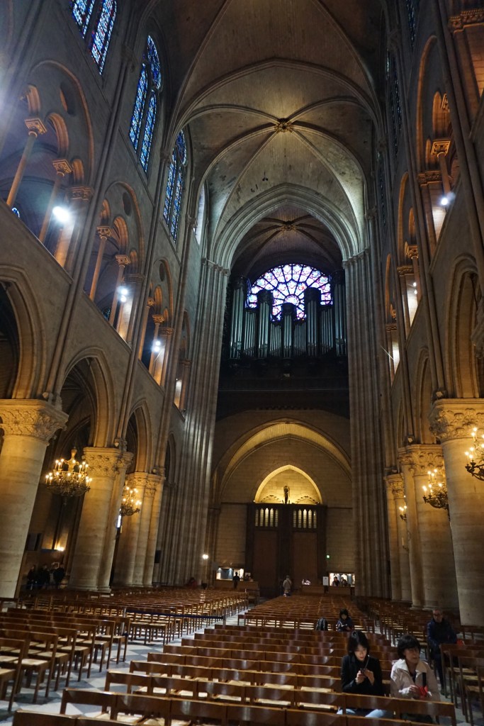 From the beautiful stained glass – especially the three giant rose windows, to the stone groin vaults of the ceiling with its delicate ribs, the ornament; all together so impressive! Behind the choir in the apse there were two wooden scale models of Notre-Dame-de-Paris. One was of the exterior of the cathedral and the other was extremely interesting: a model of the construction of the cathedral (which spanned over 180 years!), with craftspeople and laborers employing all the ingenious machinery constructed to get the job done. Mandy, an architect by training and an architectural model builder by profession was blown away: