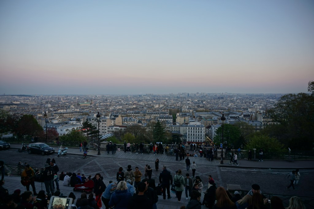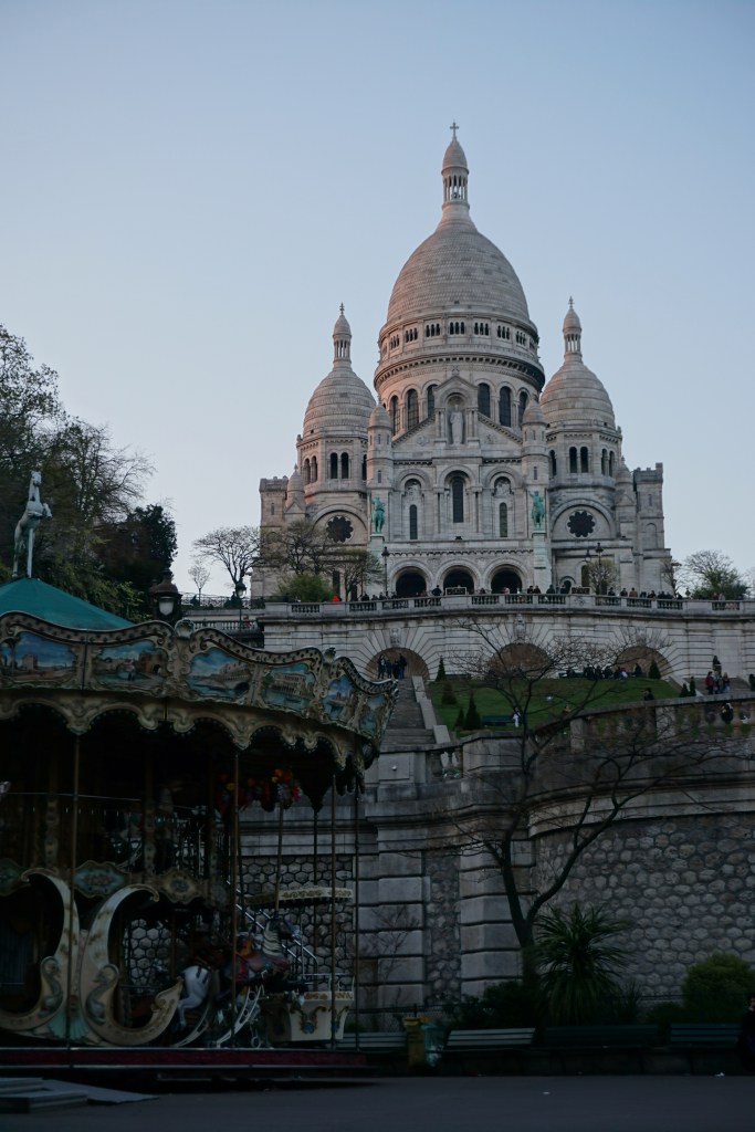 Next, we headed by Metro for the Basilica Sacré Cœur atop the highest hill in Paris, in the Montmartre district, to get a glimpse of it in the waning evening light. The basilica exterior is constructed from white marble, so it really catches the colors of sunset: