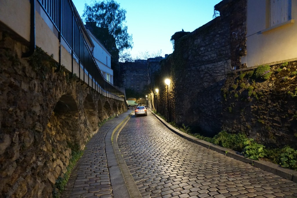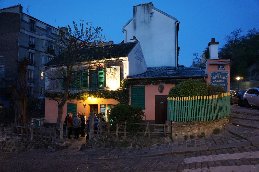 After walking through the interior of the Basilica Sacré Cœur, we wandered through the back streets of hilly Montmartre, a still medieval tangle with lots of cobblestones, windy streets, hills and stairs. We happened upon a world-famous landmark, the tiny and picturesque Cabaret Au Lapin Agile (the oldest in Montmartre), dating from the 1700’s.