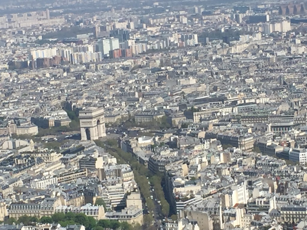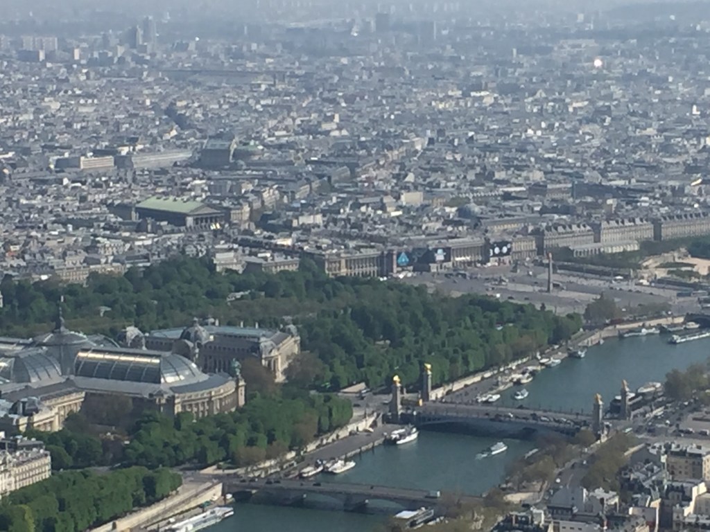 After the Notre-Dame and the Crypt Archelogique, we had timed tickets to ride to the top of the Eiffel Tower. After a short cue at the gate, we rode the quick elevator to the top, where the views of metropolitain Paris from 984 feet in the air were breathtaking, especially so because of the crisp, smogless spring morning air: