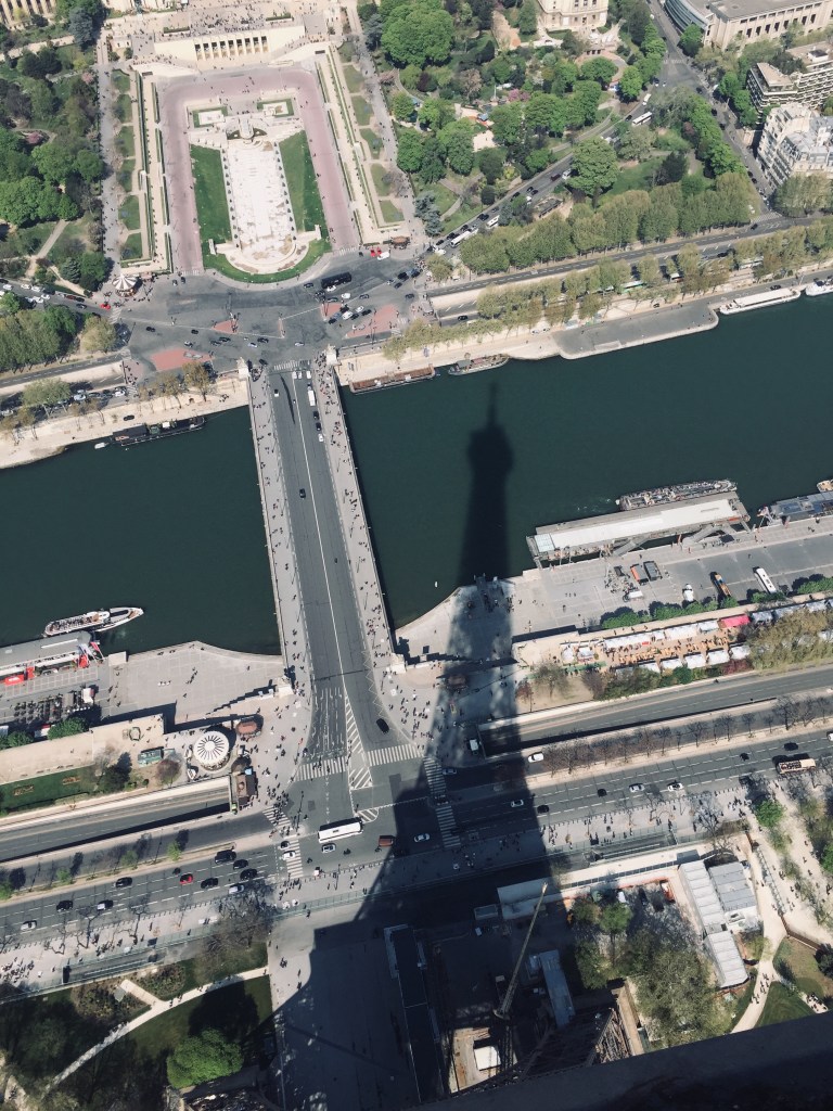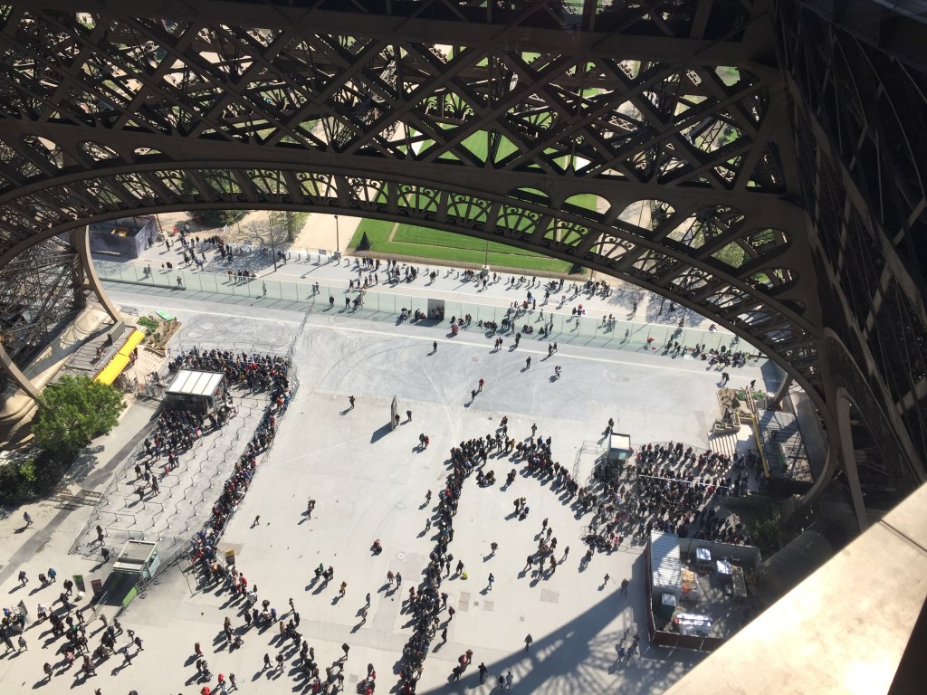 After strolling all sides of the top observation deck of the Eiffel Tower in the cold, stiff breeze of an early April morning, we took the elevator back down to the second level observation deck. The Eiffel Tower is such an engineering marvel, a 1,063 foot-tall wrought-iron lattice tower, constructed for the 1889 Paris World Exposition. Strangely enough, it was meant to be merely temporary, so was to come down after 20 years. Parisians, who at first hated the tower, grew to love it and lobbied for saving it. Cleverly enough, it was saved through the eventual installation of pioneering telecommunication equipment during World War I, a purpose it proudly serves to this day.