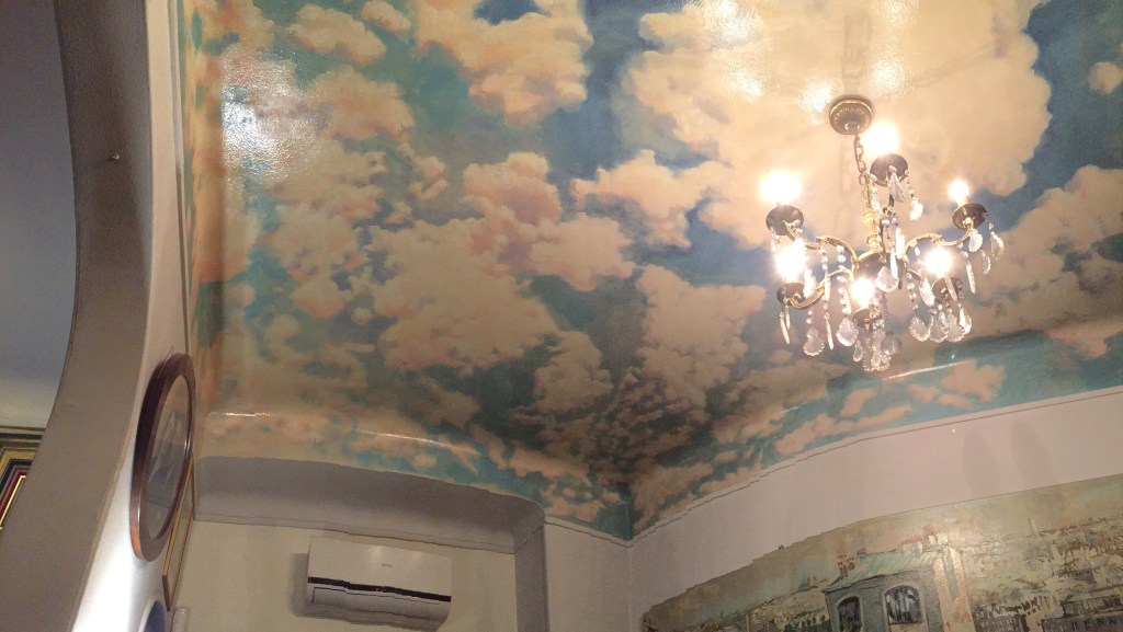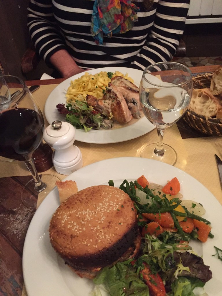 We were getting hungry, so started looking at menus hung in the windows of the neighborhood cafés – mostly out of our price-range. Happily, we eventually settled on the wonderful Café de la Butte, on the Rue Caulaincourt in Montmartre. The atmosphere of the small space was wonderful, with a cloud mural on the ceilings and a view of Paris from high atop the hills of Montmartre painted on the wall of the tiny dining room we were lead into.