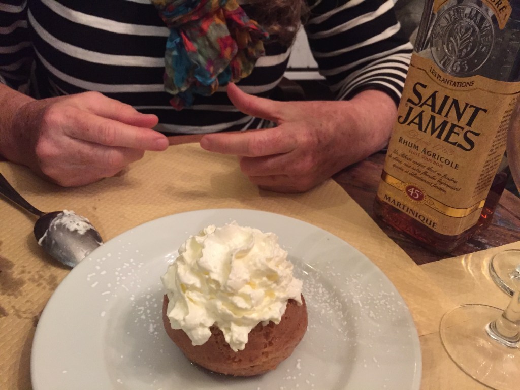 It was a very fun 45 minutes talking to her about my favorite French songstress and G.’s life on and off Broadway. She was so interesting and engaging, it was very nice to meet someone we could talk to at length in Paris. By the way, the dinner was marvelous. We ended with a spectacular dessert: Rhum Baba, with a bottle of French rum provided by the friendly waiter, meant to pour over the gleaming dessert.