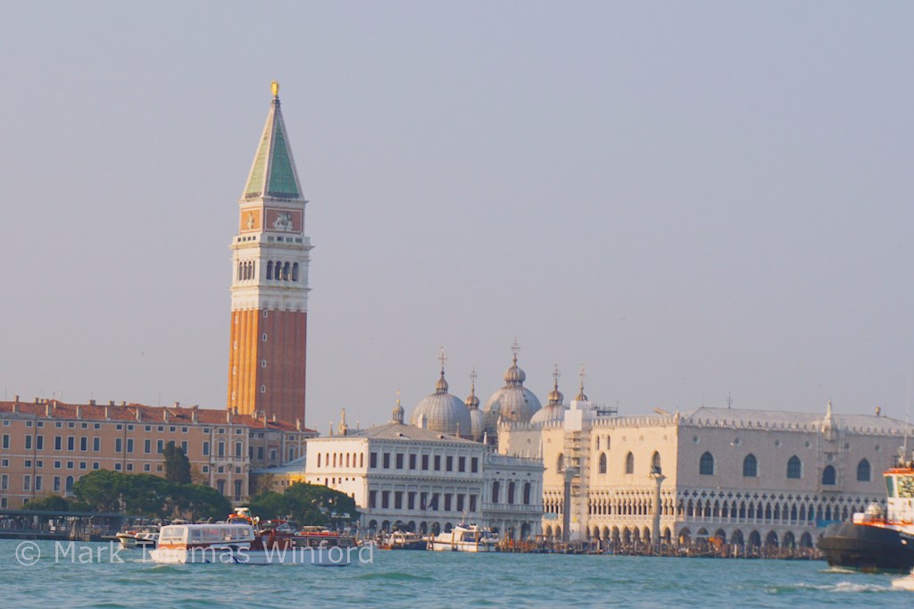 “The first St. Mark’s Basilica was built as a holy sepulcher on this spot in the 9th century to house very sacred relics—relics that had been stolen! In 828, merchants from Venice stole the body of St. Mark the Evangelist, one of the four Apostles, from Alexandria, Egypt. According to the legend, they snuck them past the (Muslim) guards by hiding them under layers of pork in barrels! While at sea, a storm almost drowned the graverobbers and their precious cargo – it’s said that St. Mark himself appeared to the captain and told him to lower the sails. The ship was saved, and the merchants said they owed their safety to the miracle. Thus, St. Mark became the patron saint of the Venetian Empire. The entire story is pictured on the 13th-century mosaic above the left door as you enter the basilica.” – courtesy, a St. Mark’s Basilica website.