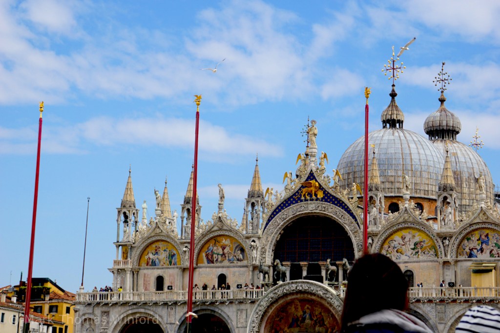 “There are more than 85,000 square feet (or 8,000 square meters) of mosaic in St. Mark’s Basilica… or enough mosaic to cover over 1.5 American football fields! The mosaics were done over 8 centuries, mostly in gold, and the result is astonishing. Enter the basilica at different times of day to see how the light makes the colors, and scenes, look different.” from the website St. Mark’s Basilica, outlining 6 stunning facts about the golden basilica’s history and architecture.