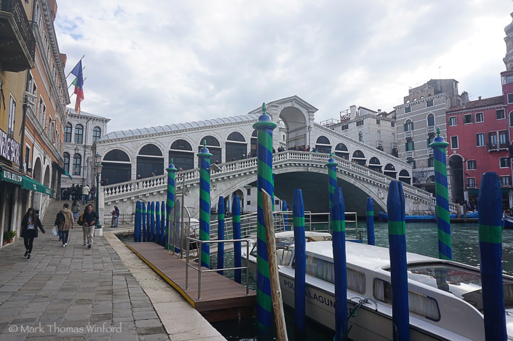 At the wonderful Pasticceria-Tonolo, I loaded up with a sackful of baked treats for Mandy and I to enjoy back in the sunlight-bathed apartment. I bought several of the best-looking kinds of pastries and even a huge meringue for us to share! After a lingering strong Italian coffee and pastry breakfast, we headed back through the San Toma district’s crowded, narrow passageways to the huge Ponte di Rialto bridge over the Canalé Grandé: