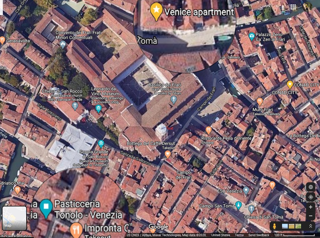 Here is a satellite shot from Google Maps of the San Polo district, Venice’s smallest sestiere (district), which borders the Canale Grande and the sestiere of Dorsoduro and Santa Croce. It is well-known for its famous seafood, fruit and vegetable market, (the Rialto Market) in the mornings, and its lively bar scene in the evenings. The Pasticceria Tonolo was a mere stone’s throw away from us from the apartment building’s front door: