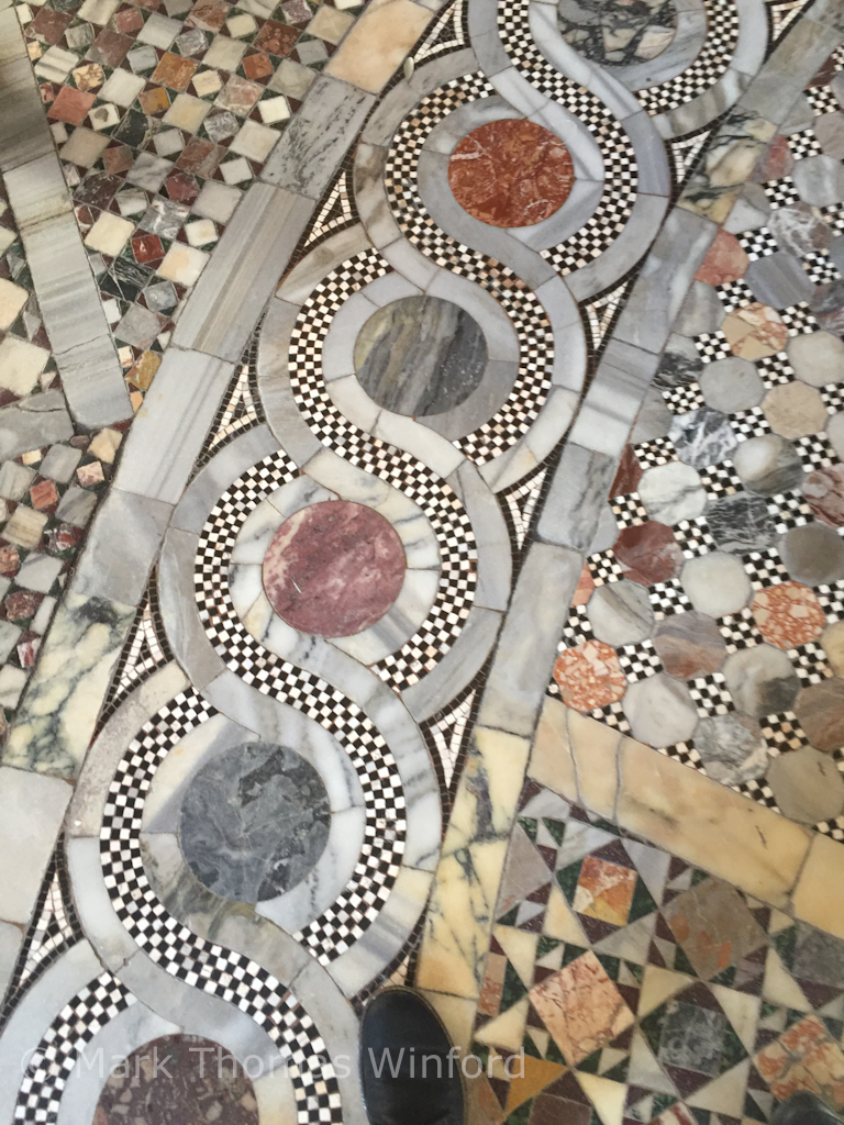 Work on the present-day basilica, begun after the original, 9th-century basilica, built to house the kidnapped body of St. Mark the Evangelist, burned to the ground during a citizen-led rebellion in 828 A.D. The replacement basilica burned to the ground again in 976 A.D. The present-day basilica was rebuilt on the site of the original, burned basilicas, beginning in 1063 A.D., with consecration of the “new” basilica in 1093 A.D., according to Wikipedia’s Basilica di San Marco – besting Paris’ magnificent medieval French Gothic Notré Dame de Paris cathedral by nearly 200 years! We greatly-admired the acres of stunning mosaics covering the Greek-Cross plan floor of the giant basilica: