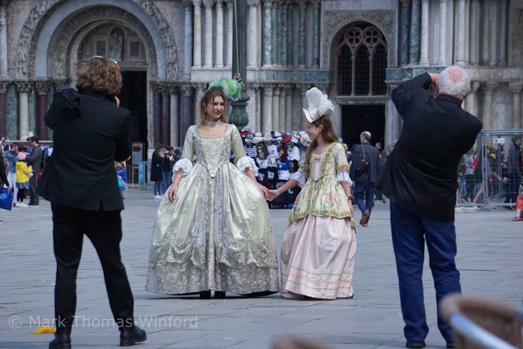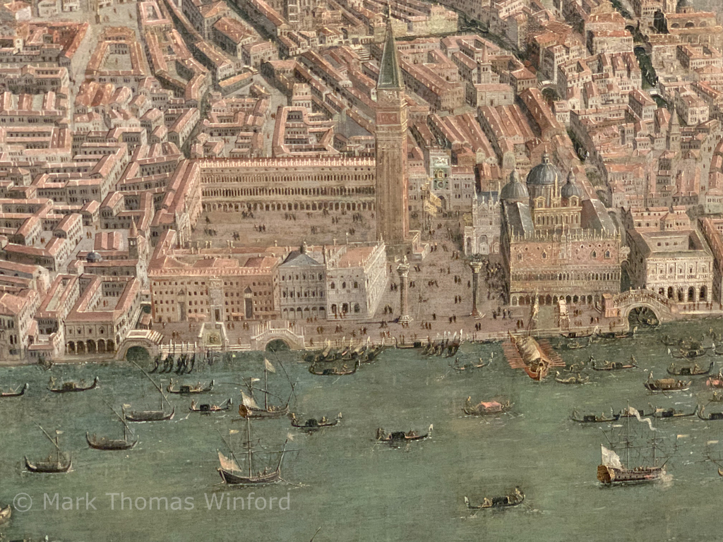 Adorning the imposing western (main) façade on the front of Basilica di San Marco, as seen from the main body of the sprawling Piazza San Marco, are the (replicas of) Horses of Saint Mark-Lysippos – from a Basilica di San Marco website: “The Horses of Saint Mark were installed on the balcony above the portal of the basilica in about 1254. They date to Classical Antiquity, though their date remains a matter of debate, and presumably were originally the team pulling a quadriga chariot, probably containing an emperor. By some accounts they once adorned the Arch of Trajan in Rome.”
