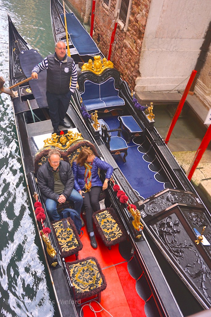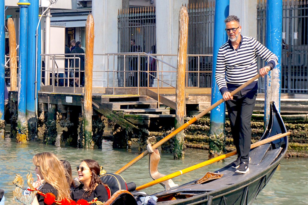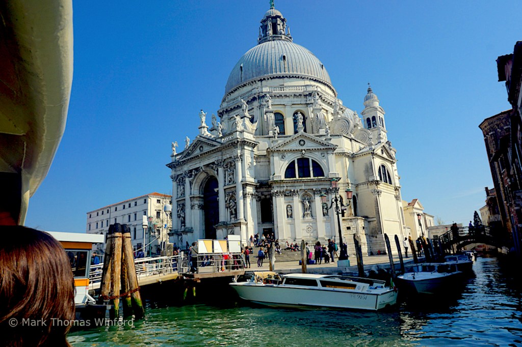 We soon passed the Guggenheim Collection, Peggy Guggenheim’s former mansion, a low-slung palazzo on the Canalé Grandé – a building strange in Venice for its lowness. We then passed what European travel guru Rick Steves calls the “Catholic wedding cake church,” Basilica di Santa Maria della Salute. “The church makes good on an official appeal by the Venetian Senate directly to the Madonna in 1630, after 80,000 Venetians had been killed by (the black) plague. The Senate promised the Madonna a church in exchange for her intervention on behalf of Venice – no expense or effort spared.” (courtesy, Lonely Planet)