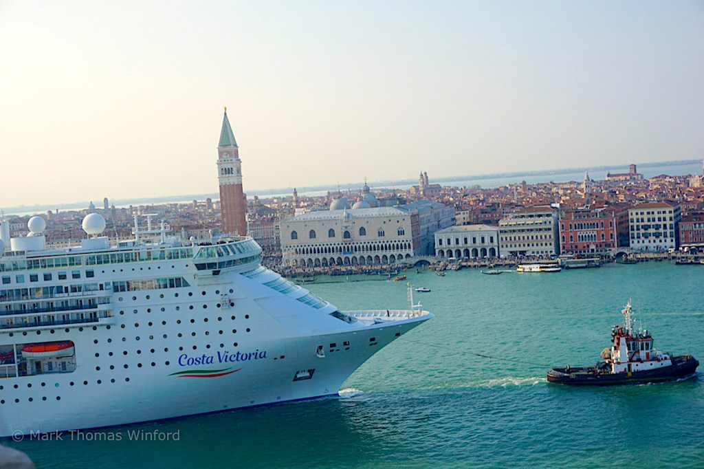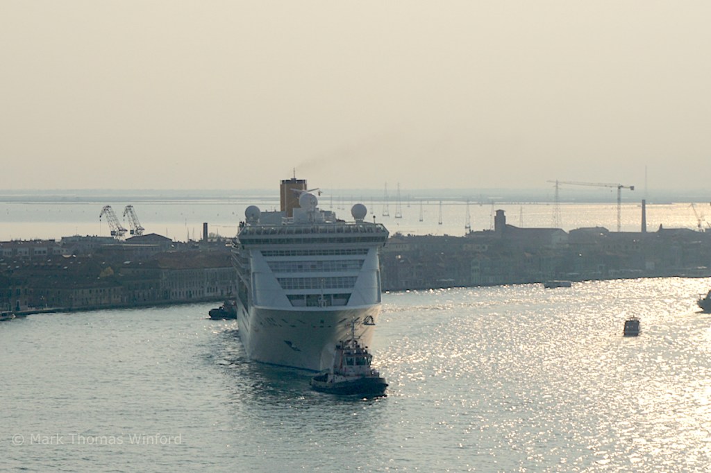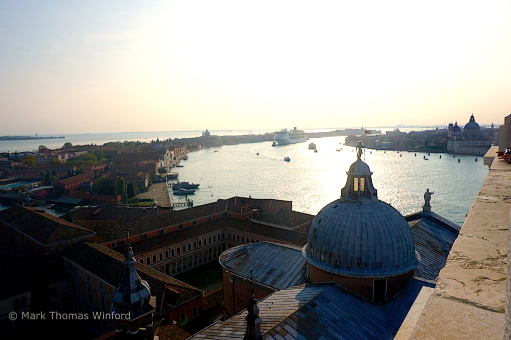 Also from the San Giorgio Maggiore campanile, we watched as a huge cruise ship slowly made its way down the wide Rio dei Carmini, between the Dursoduro district on one of the main islands and the Giudecca district on the outlying islands. The ship eventually made its way past the Palazzo Ducalé and the Campanile di San Marco on its way to the Adriatic.