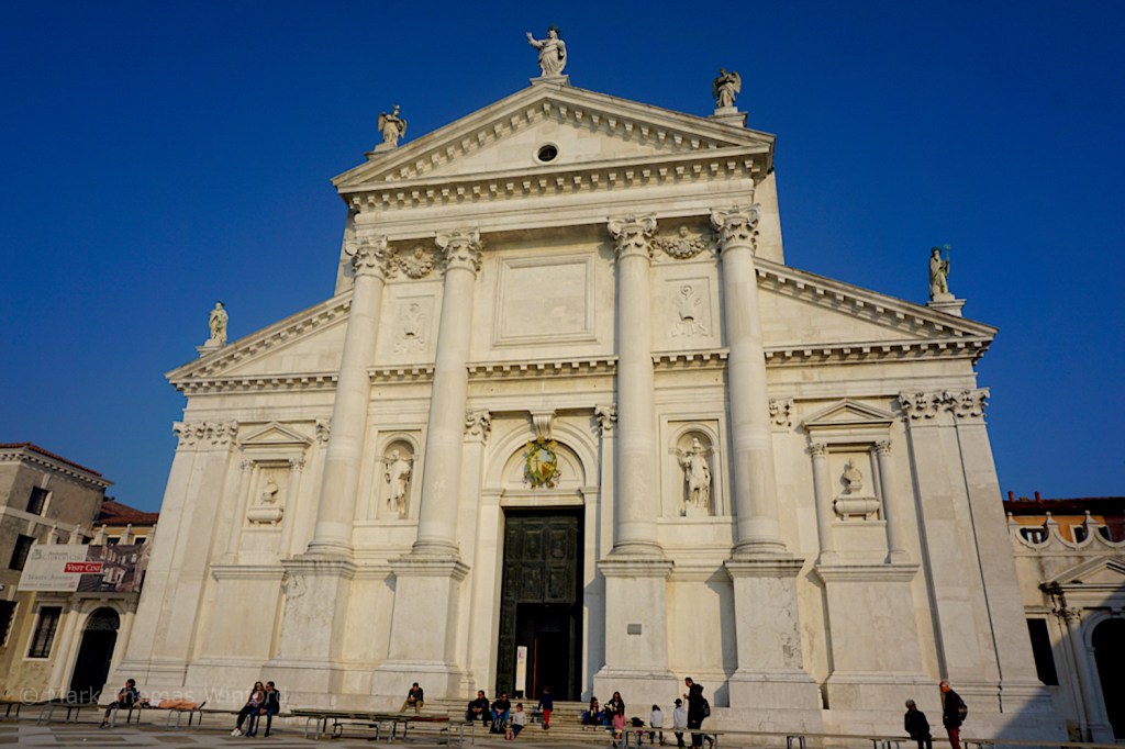 After arriving at the San Zaccaria vaporetto station, we switched to a different vaporetto to cross the Bacino di San Marco to the island home of Andrea Palladio’s (considered one of the most influential architects of all time) San Giorgio Maggiore church, home to a tall campanile (bell tower) affording incredible views back to the main islands of Venice, especially the central district of San Marco and the Palazzo Ducale, Basilica di San Marco, Campanile di San Marco and the Piazza di San Marco from on high. Construction of the San Giorgio Maggiore church lasted from 1565 to 1611.