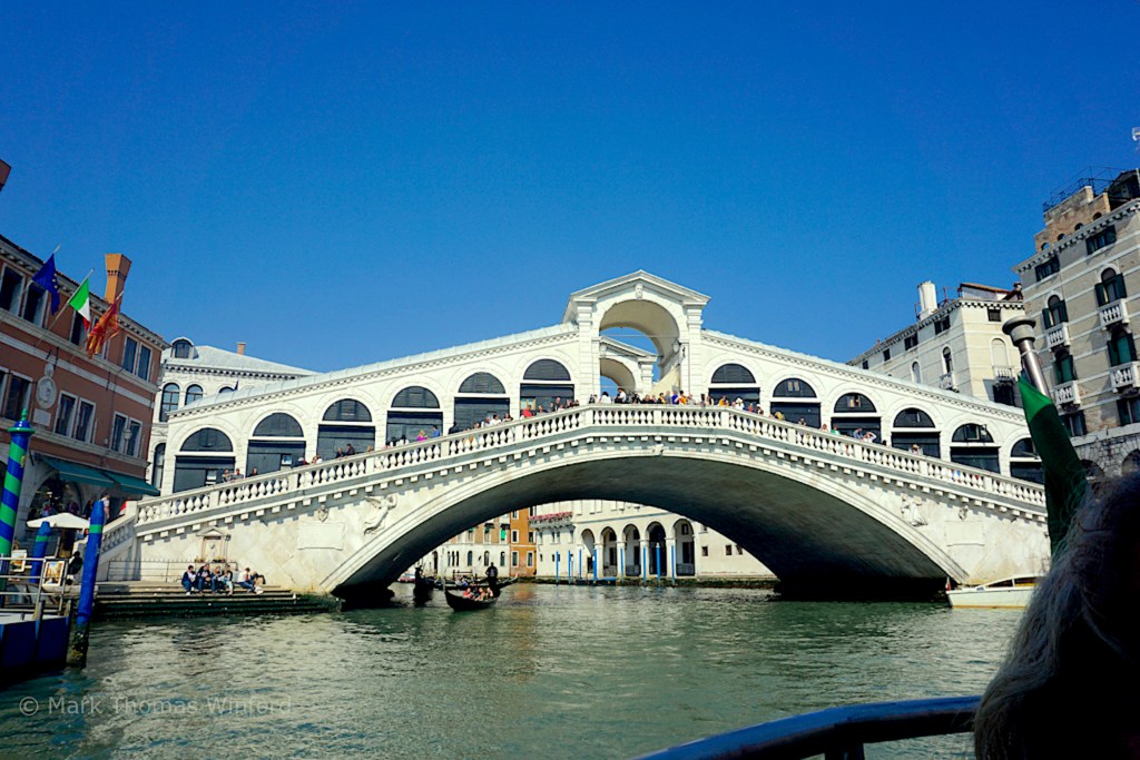 This morning I awoke earlier than Mandy again, and took a long morning walk by myself to buy Italian bakery treats again at the marvelous, previously-discovered bakery, Pasticceria Tonolo in the San Polo siestre (district), only 3 minutes by foot from our apartment in the Ca’ Badoer deiBarbacani. Then on to the fashionable San Marco siestre (district – the siestre San Marco includes St. Mark’s Basilica, as well as the island home of the San Giorgio Magiore church, across the Bacino di San Marco from St. Mark’s), across the Ponte di Rialto bridge over the Canalé Grandé to the post office to mail postcards, gifts and letters and on to another well-stocked art supply store.