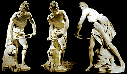 Michelangelo’s David is intellectualized – David seems to be contemplating his coming action, rather than poising himself to take it, as in the muscularly taut Bernini’s David. This David harks back to Greek and Roman art, celebrating the beauty of God’s ultimate creation – the human body. This is a decidedly high Renaissance stance – that of idealizing the human form, of objectifying it, of making it godlike.