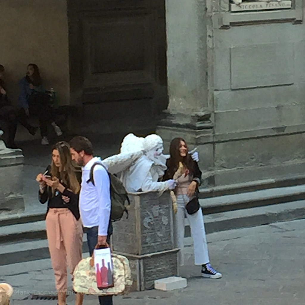 Later that day, passing through the courtyard of the Uffizi Gallery, I saw the same likeness of Mary Magdalene, posing for photographs from passers-by, perched atop her pedestal. Another time I saw a living “sculpture” of Cupid, complete with his wings and arrows. I even paused for a fun moment to have my photo taken with him. He was smooching at passers-by, trying to attract their attention!
