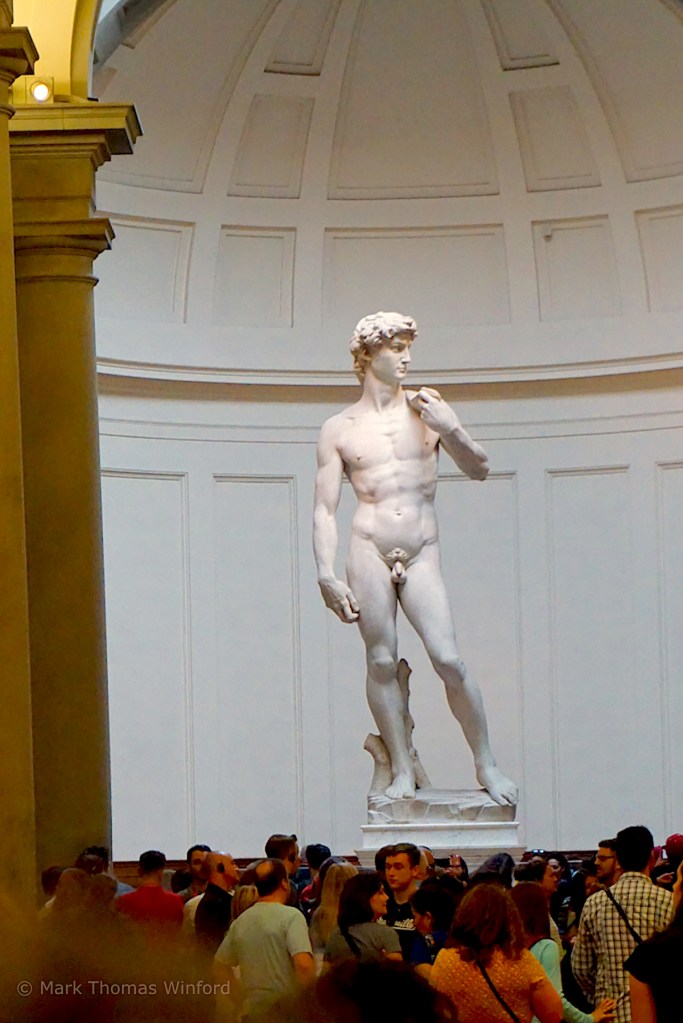 After visiting the Great Museum of the Dome, we had lunch at a sidewalk cafè, looking out over the huge plaza surrounding the looming Duomo. From here we split up, so I could make my date with my guide, mariogesu to see Michelangelo’s David at the Accademia Gallery, and Mandy could go to the Medici’s Palazzo Pitti, across the Arno, where she would find paintings by her beloved Italian master, Caravaggio, among many others.