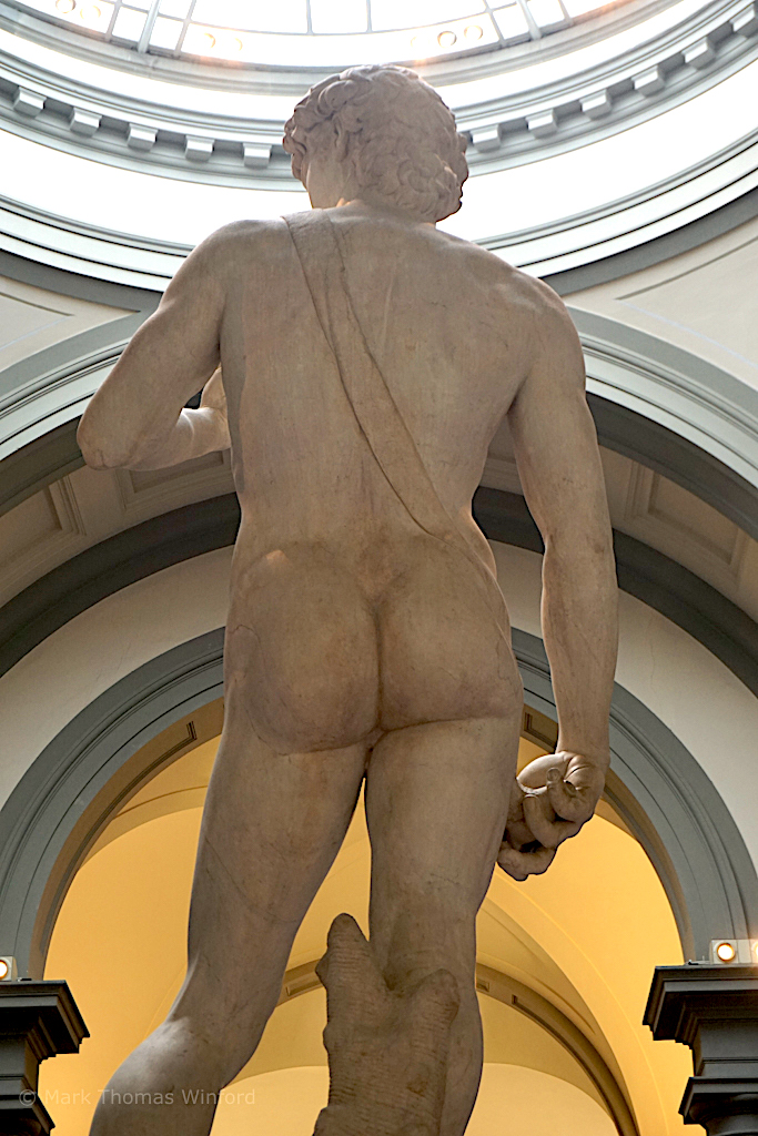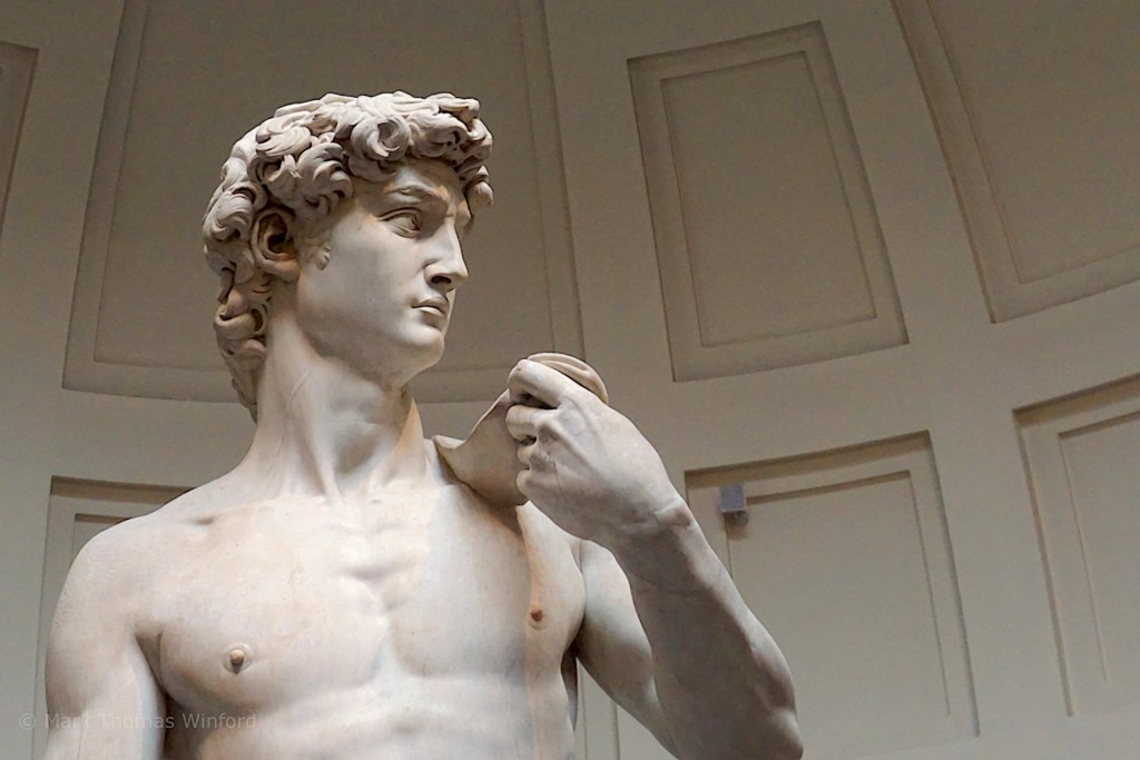 Of Michelangelo’s David, it is said, “traditionally, David was portrayed after his victory, triumphant over Goliath. But Michelangelo breaks away from the traditional way of representing David. He does not present us with the winner, the giant’s head at his feet and the powerful sword in his hand, but portrays the youth in the phase immediately preceding the battle: perhaps he has caught him just in the moment when he has heard that his people are hesitating, and he sees Goliath jeering and mocking them.” from David on Wikipedia. David‘s eyes are supposedly focused on his rival, Goliath, but more figuratively, on Rome, the Republic of Florence’s political and cultural rival.