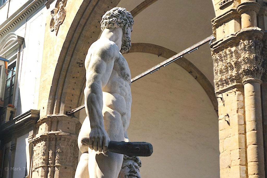 The Piazza della Signoria contains many important civic sculptures, including “Michelangelo’s David (which) also stood at the entrance from its completion in 1504 to 1873, when it was moved to the Accademia Gallery. A replica erected in 1910 now stands in its place, flanked by Baccio Bandinelli‘s Hercules and Cacus,” from the Palazzo Vecchio website.