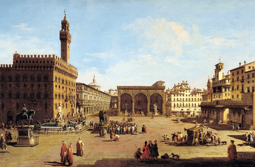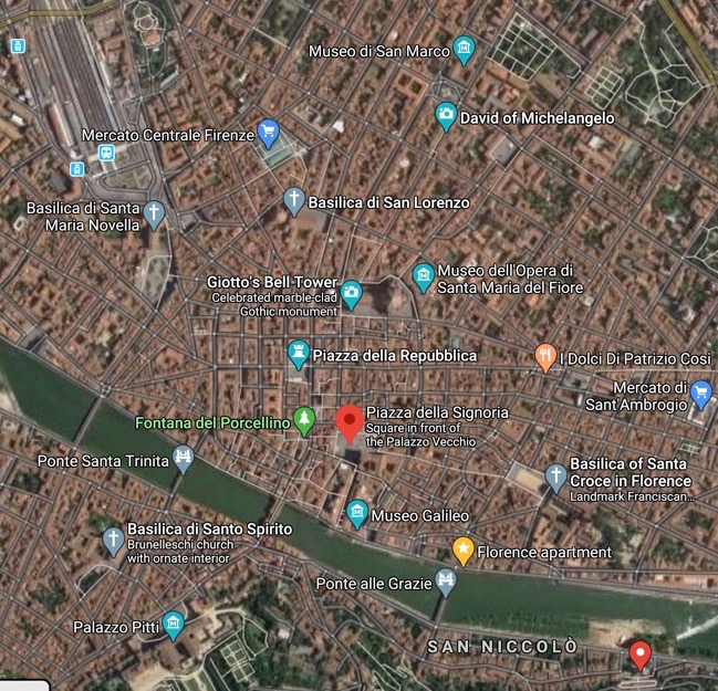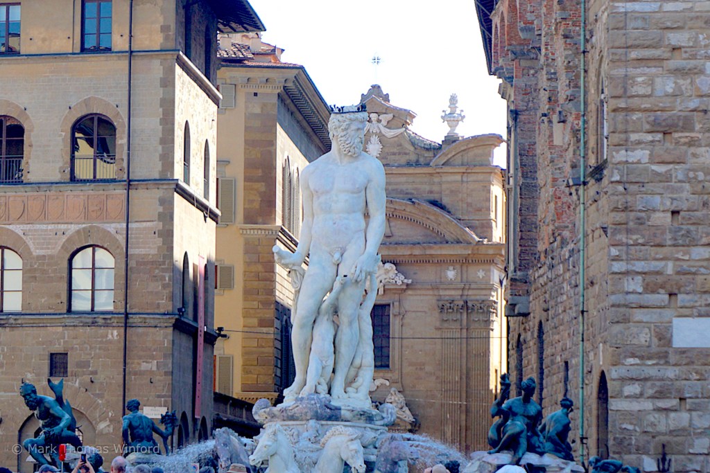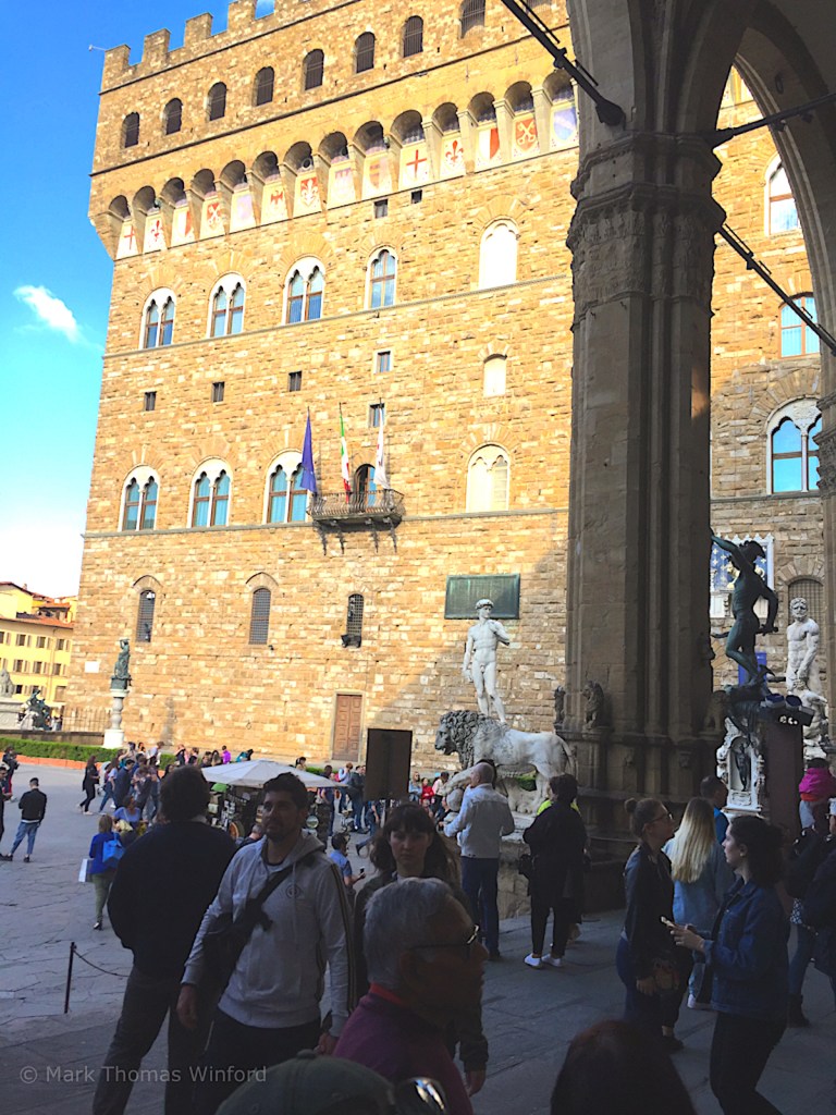 After breakfast, we walked through the narrow old-town streets of Florence toward the center of town, the Piazza della Signoria, literally, the town square – in front of the massive, Romanesque, crenellated fortress-palace, the Palazzo Vecchio. We soon spotted the 94-m-tall Palazzo Vecchio, looming high, with its tower, above the lower 5 and 6-story buildings that make up old-town Florence.