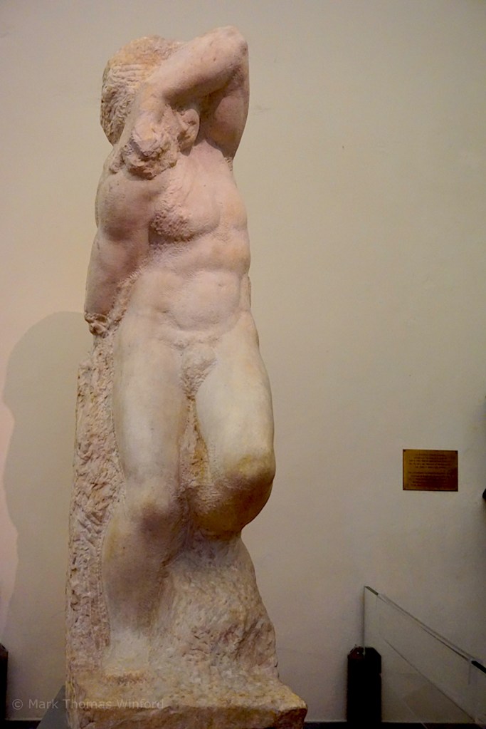 Our excellent, academic, art-historian tour guide, mariogesu, demonstrated with his own body and gestures the feeling that Michelangelo was attempting to portray in the Bound slave statue, carved from a solid block of marble, thusly: Mario writhed and squirmed as he deformed his own body, demonstrating how the lodged figure of Atlas must feel, bound as he is in the block of stone – a very effective demonstration indeed. Once again, the great mariogesu made the work of the master, Michelangelo, “come alive” for those of us lucky enough to be part of his small tour group at the Accademia Galleria that day!