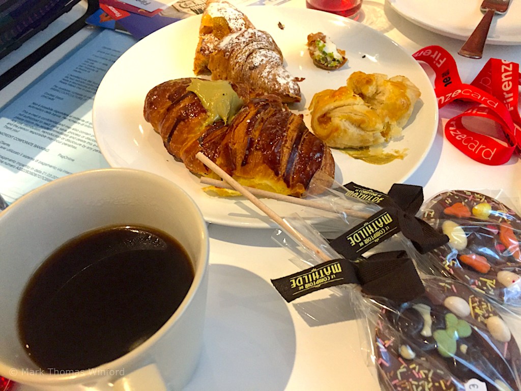 This morning I received a recommendation for a wonderful, authentic Italian bakery from our friendly doorman. It was about 2 miles roundtrip, a wonderful early morning walk, from our apartment – to get there I crossed the bridge, the Ponte alle Grazie, right in front of our apartment, over the Arno, and headed up the street, the Lungarno Serristori, running alongside the Arno, toward a small square and the promised bakery.
