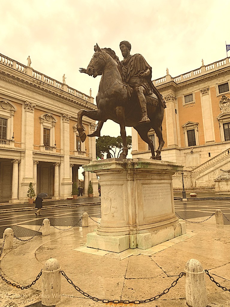 After the Palatine Hill we walked back down into the Roman Forum and up the many steps to the Capitoline Hill. None other than Michelangelo designed the plaza in front of the governmental buildings on three sides of the plaza (he also designed the facades for two of these building), dominated by a bronze equestrian statue of Marcus Aurelius, which was originally erected in 175 A.D., possibly in the Roman Forum. These make up the Piazza del Campidoglio on Capitoline Hill.
