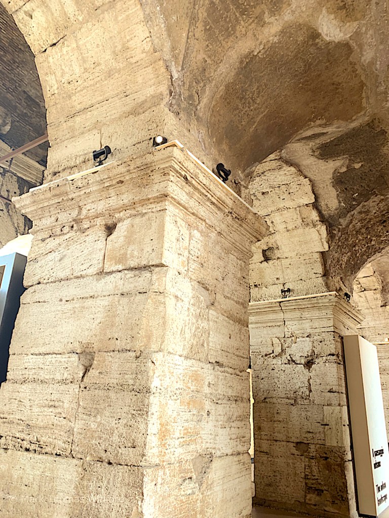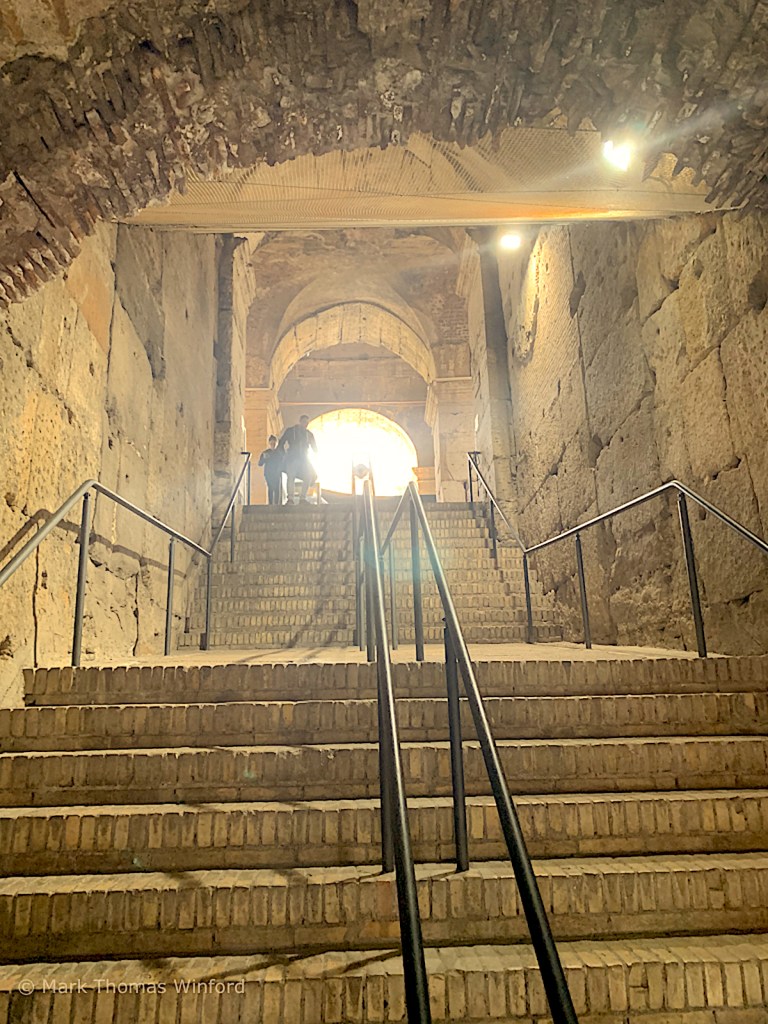 From the gallery spaces, we proceeded to enter the body of the Colosseum, by ascending some brick stairways through interconnecting passageways, under imposing brick and stone arches.