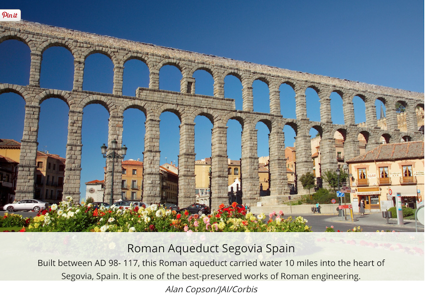 It is simply mind boggling that the Colosseum was so well-designed that it could hold 50,000-80,000 spectators, yet all of the spectators could exit the Colosseum in 15 minutes. What a marvel of Roman engineering! The Romans developed many engineering marvels, for example, their ingenious aqueducts, which carried water from outlying springs to cities, such as the aqueduct in Segovia, Spain – one of the best-preserved of all Roman aqueducts.