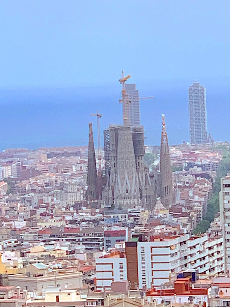 After the performance we wandered through the Park Güell upper environs for quite some time. This was such a fantasy world that Antoni Gaudi created here. From these beautiful quarters, high on the hills overlooking the big city, we could gain a good view of the massive Sagrada Familia, the Basílica de la Sagrada Família, on the plains.