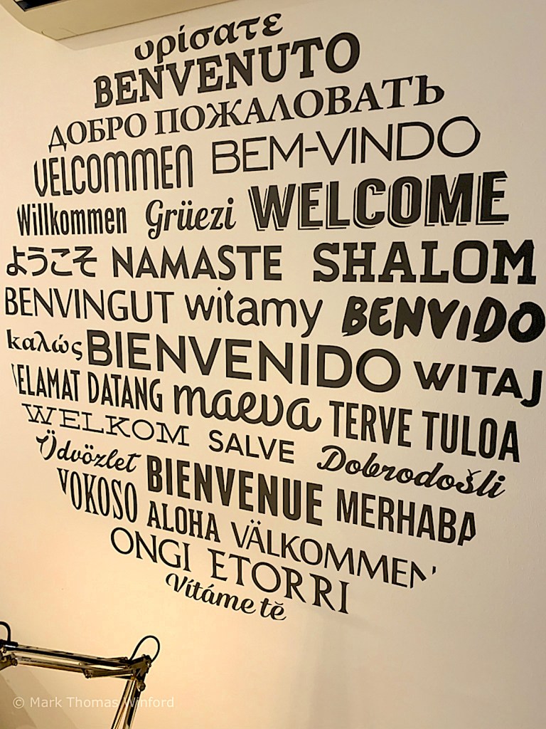 After a full day at the Sagrada Família, we ate dinner and retired to our apartment garden, to spend time with our guidebooks, planning out our days in Barcelona and I inked in my pencil sketch of a portion of the façade of the Sagrada Família. I am including a picture of the mural inside our apartment, featuring the word “welcome” in languages of the world. It truly was a welcoming and relaxing space.