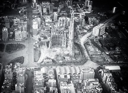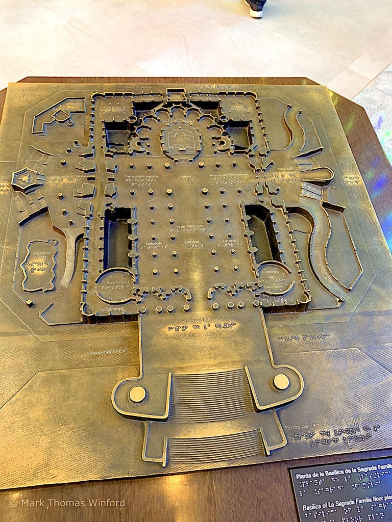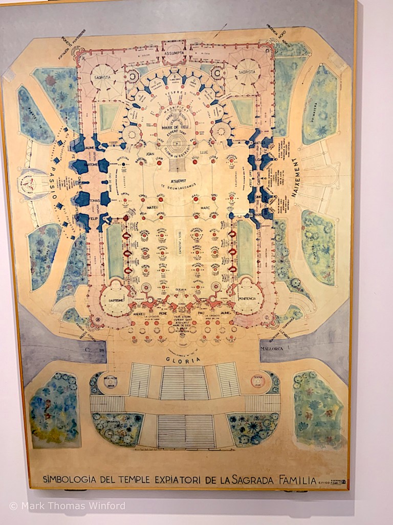 “The length of the Sagrada Família is short in comparison to its width, and has a great complexity of parts, which include double aisles, an ambulatory with a chevet of seven apsidal chapels, a multitude of steeples and three portals, each widely different in structure as well as ornament. Where it is common for cathedrals in Spain to be surrounded by numerous chapels and ecclesiastical buildings, the plan of this church has an unusual feature: a covered passage or cloister which forms a rectangle enclosing the church and passing through the narthex of each of its three portals. With this peculiarity aside, the plan, influenced by Villar’s crypt, barely hints at the complexity of Gaudí’s design or its deviations from traditional church architecture. There are no exact right angles to be seen inside or outside the church, and few straight lines in the design.”