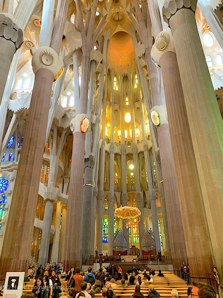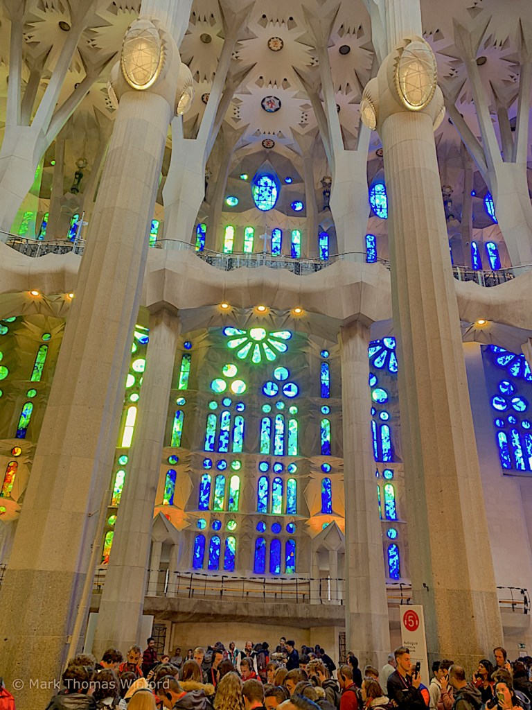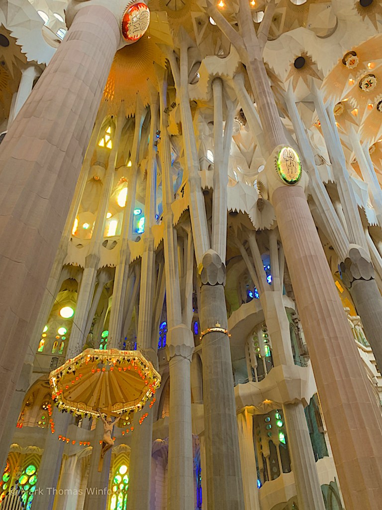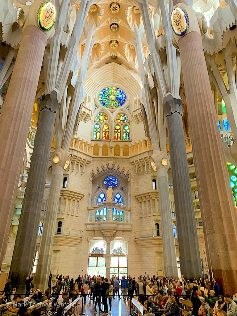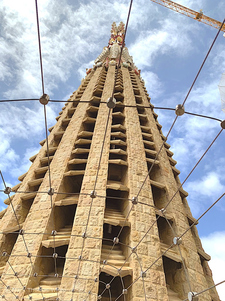 I had purchased timed tickets which would allow us entry into the Sagrada Família along with a personal headset in English and a ride up the Passion Tower elevators. Seeing the state of the construction, it is amazing that the construction is scheduled to be complete by 2026. “Chief architect Jordi Fauli announced in October 2015 that construction is 70 percent complete and has entered its final phase of raising six immense steeples. The steeples and most of the church’s structure are to be completed by 2026, the centennial of Gaudí’s death; as of a 2017 estimate, decorative elements should be complete by 2030 or 2032.” (from Wikipedia)