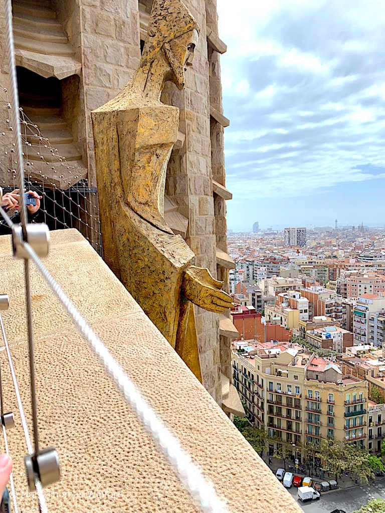 From the soaring interior, we cued up to take our timed ride up the elevator inside the Passion façade. The view from atop the Passion tower was awesome. From here we could examine details of the other spires. Their crenelated tops were marvelous, as were the spire “chalices with bunches of grapes, representing the Eucharist.” (from Wikipedia)