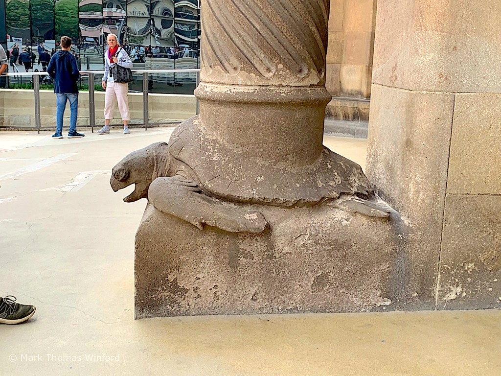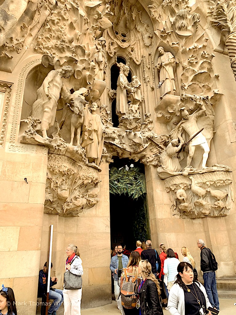 We began the entry sequence to the basilica at the Nativity façade. “Constructed between 1894 and 1930, the Nativity façade was the first façade to be completed. Dedicated to the birth of Jesus, it is decorated with scenes reminiscent of elements of life. Characteristic of Gaudí’s naturalistic style, the sculptures are ornately arranged and decorated with scenes and images from nature, each a symbol in its own manner. For instance, the three porticos are separated by two large columns, and at the base of each lies a turtle or a tortoise (one to represent the land and the other the sea; each are symbols of time as something set in stone and unchangeable). In contrast to the figures of turtles and their symbolism, two chameleons can be found at either side of the façade, and are symbolic of change.