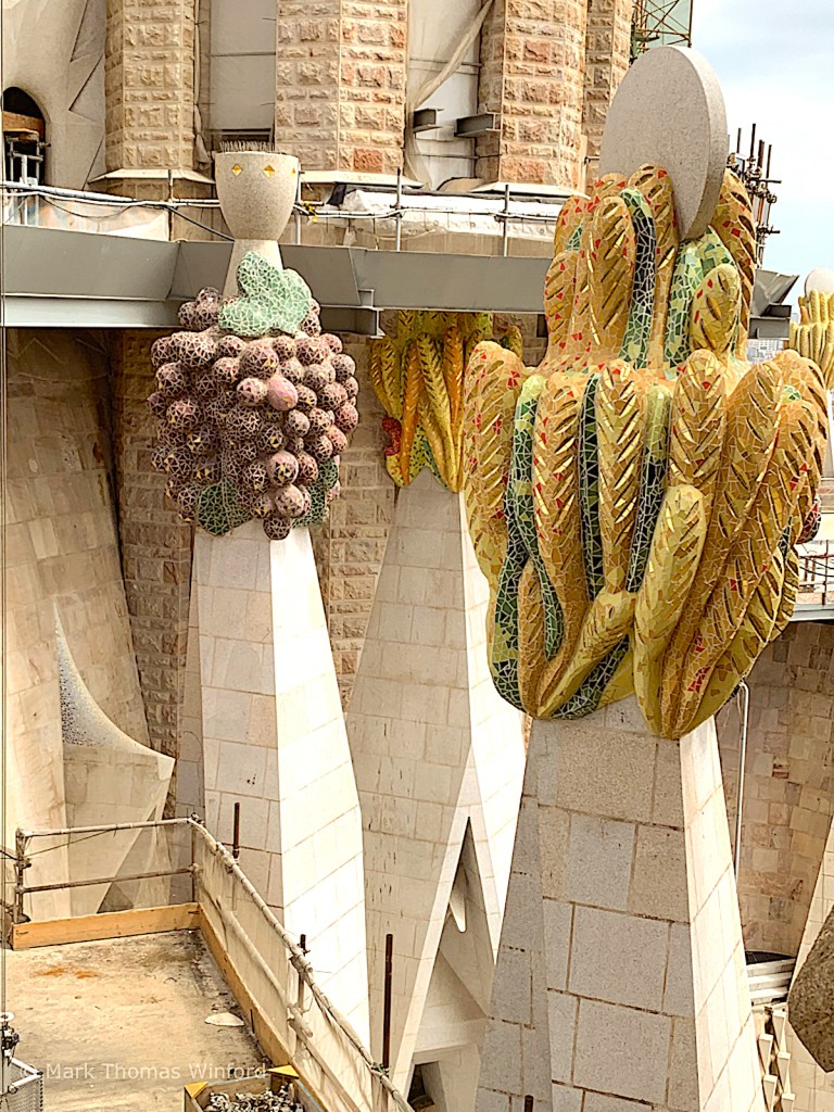 “The central spire of Jesus Christ is to be surmounted by a giant cross; its total height (172.5 metres (566 ft)) will be less than that of Montjuïc hill in Barcelona, as Gaudí believed that his creation should not surpass God’s. The lower spires are surmounted by communion hosts with sheaves of wheat and chalices with bunches of grapes, representing the Eucharist. Plans call for tubular bells to be placed within the spires, driven by the force of the wind, and driving sound down into the interior of the church. Gaudí performed acoustic studies to achieve the appropriate acoustic results inside the temple.” (from Wikipedia)