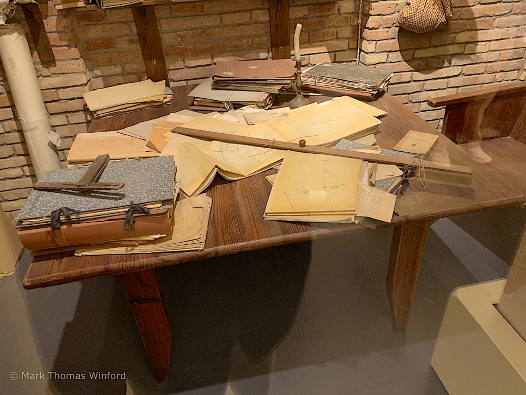 After a final pass through the nave we went down into the crypt. Here we saw a model of Gaudi’s workshop, complete with blueprints and drafting instruments.