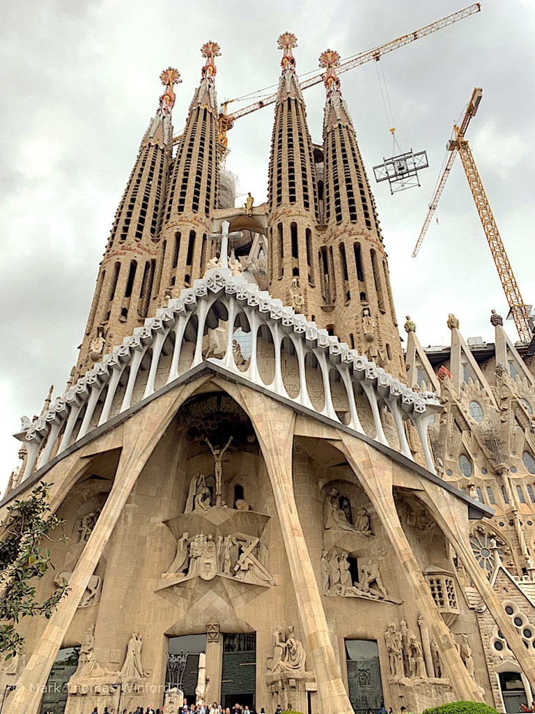 Upon arriving at our destination at the intersection of two of Barcelona‘s broad avenues, we sat down outside at a coffee shop across the street, giving me time to open my sketchbook and attempt to capture a portion of the looming facade of the basilica. I was fascinated by the ongoing construction activity – there were so many cranes hauling materials into the sky and placing new parts of the great basilica into place.