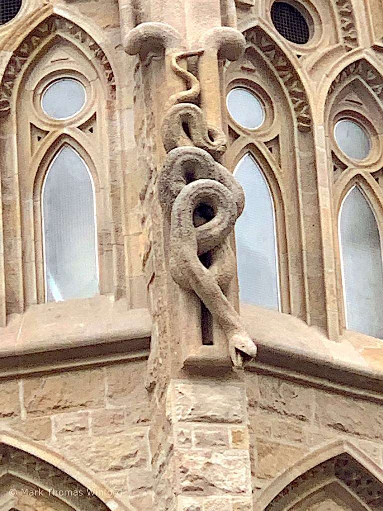 Facing the setting sun, indicative and symbolic of the death of Christ, the Passion Façade is supported by six large and inclined columns, designed to resemble Sequoia trunks. Above there is a pyramidal pediment, made up of eighteen bone-shaped columns, which culminate in a large cross with a crown of thorns. Each of the four steeples is dedicated to an apostle (James, Thomas, Philip, and Bartholomew) and, like the Nativity Façade, there are three porticos, each representing the theological virtues, though in a much different light.” (from Wikipedia)