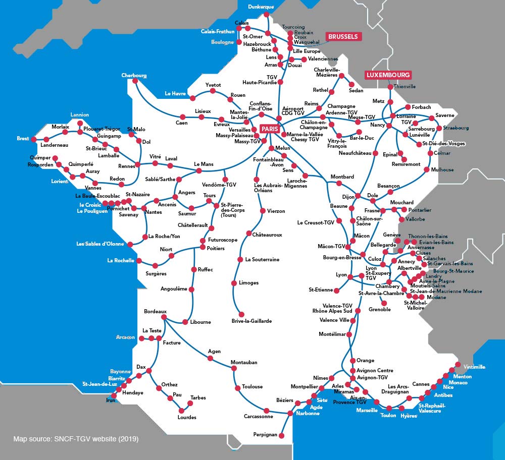 This morning we hopped back on board the tiny, one-car train for the ride along the beautiful, meandering Dordogne River, from Sarlat-la-Canéda to Périgueux, and then on to a faster, but still local train from Périgueux, back to the large city of Bordeaux. At the Bordeaux St. Jean central train station we boarded a duplex (double-decker) high-speed French TGV (Train Grande Vitesse – “very high speed”) train bound for Paris, where we, as usual for the busier trains, had reserved seats. We sat on the upper deck for the wonderful view from high above the tracks. We got off the high-speed train at the stop at Angoulême station, to meet our friends S. and G., to stay overnight in their lovely restored farmhouse, the Charente. See below for a TGV service map for all of France: