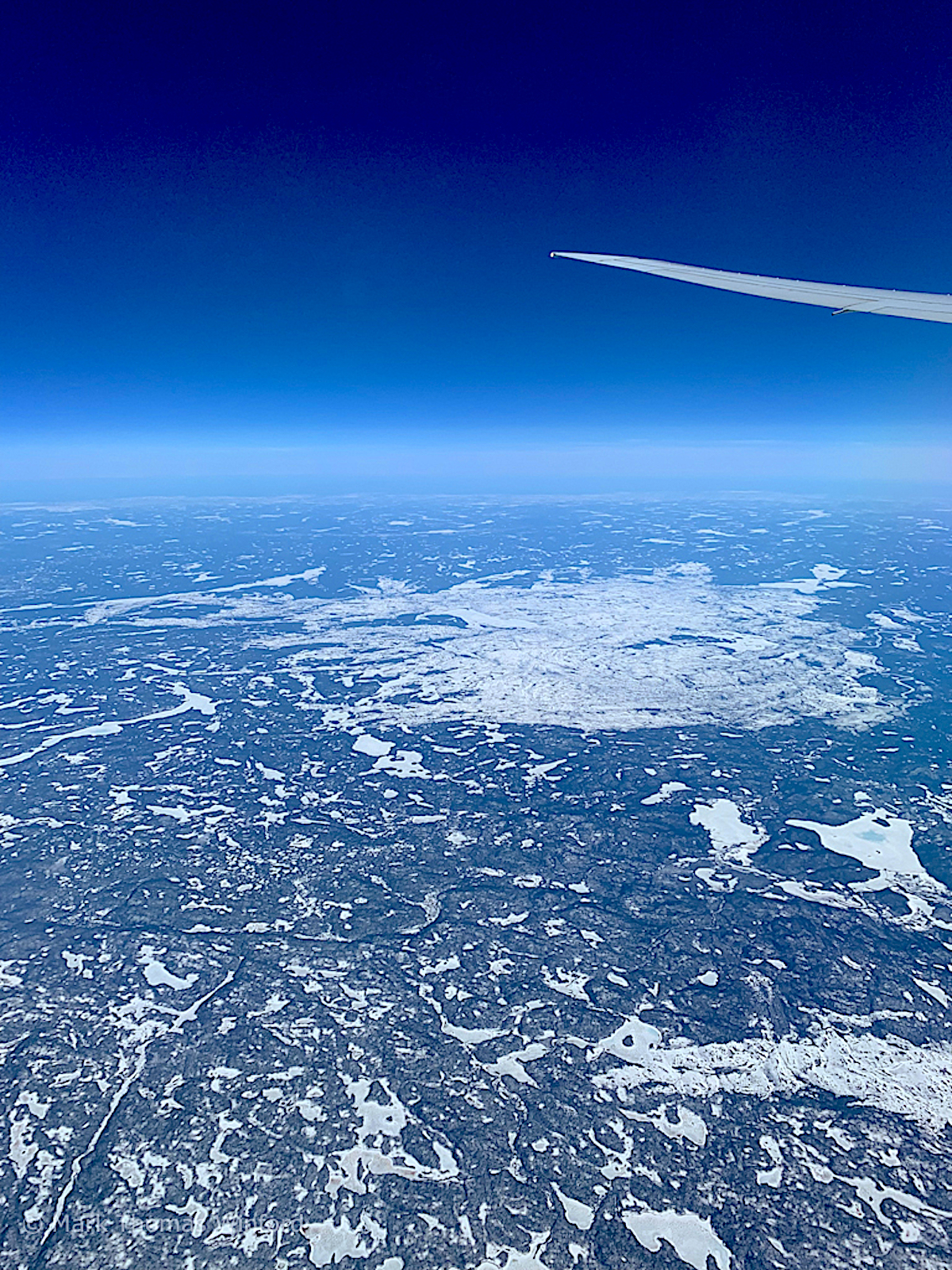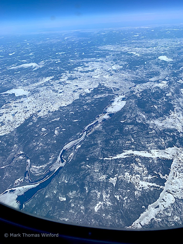 We hit the coast of North America in, I think, Labrador. All I know is, it is the middle of May and it is totally frozen over, so I think it must be Labrador. There were lots of frozen and snow-covered mountains, lakes and rivers and no sign of civilization anywhere to be seen. This went on forever.